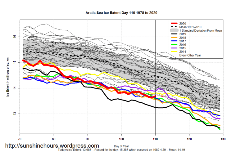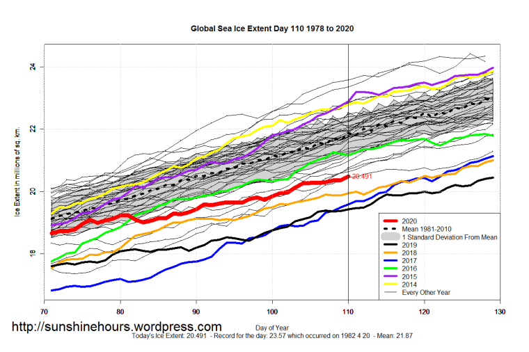 Sea Ice Extent (Global Antarctic and Arctic) – Day 110 – 2020 Published on April 20, 2020April 20, 2020 by sunshinehours1 South / North Like Loading... Related