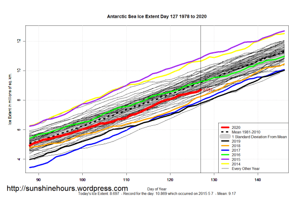 Sea Ice Extent (Global Antarctic and Arctic) – Day 127 – 2020