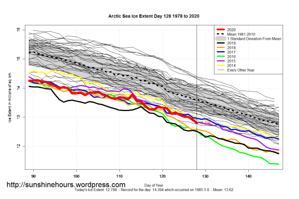 Sea Ice Extent (Global Antarctic and Arctic) – Day 128 – 2020