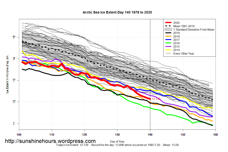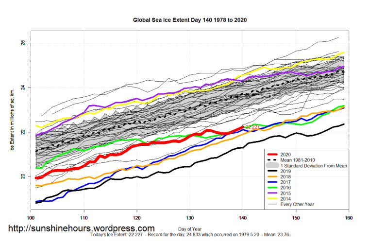 Sea Ice Extent (Global Antarctic and Arctic) – Day 140 – 2020 Published on May 20, 2020May 20, 2020 by sunshinehours1 South / North Like Loading... Related
