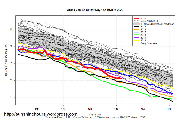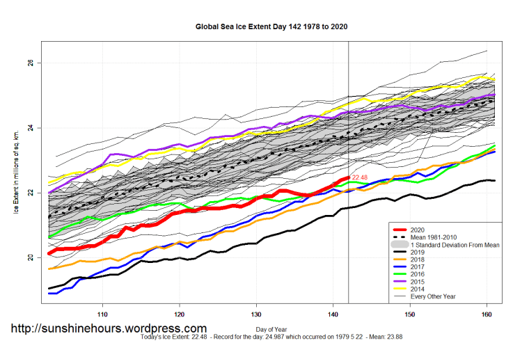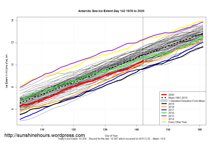 Sea Ice Extent (Global Antarctic and Arctic) – Day 142 – 2020 Published on May 22, 2020May 22, 2020 by sunshinehours1 South / North Like Loading... Related
