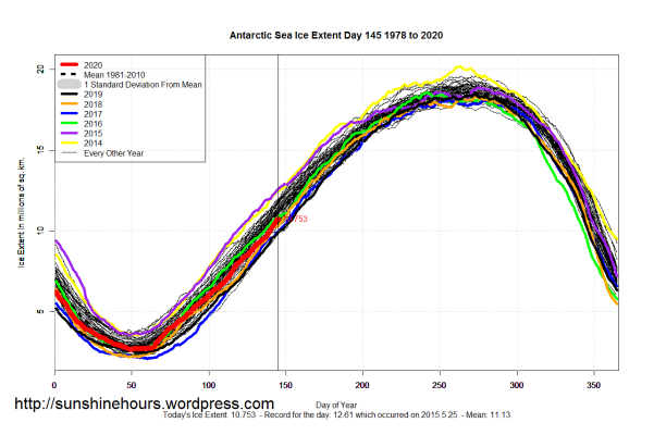 Sea Ice Extent (Global Antarctic and Arctic) – Day 145 – 2020