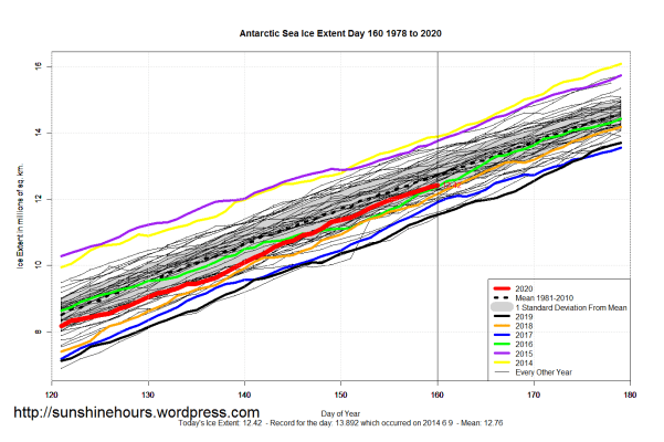 Sea Ice Extent (Global Antarctic and Arctic) – Day 160 – 2020