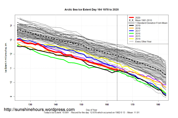 Sea Ice Extent (Global Antarctic and Arctic) – Day 164 – 2020