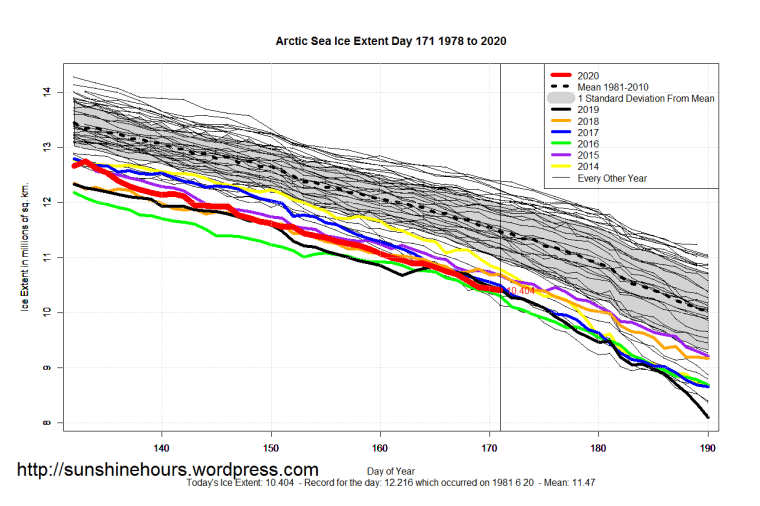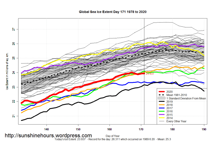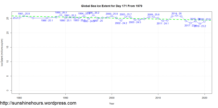 800 years before it all melts? – Sea Ice Extent (Global Antarctic and Arctic) – Day 171 – 2020
