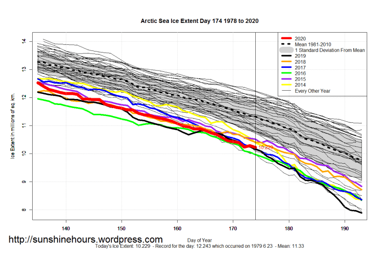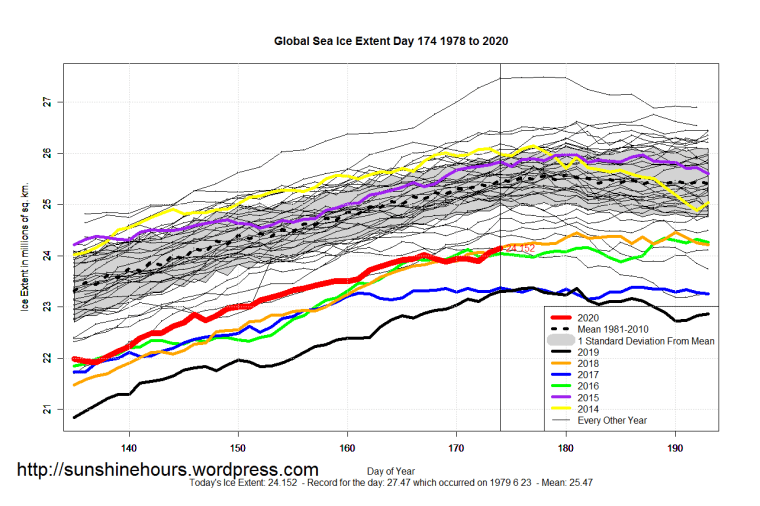 Sea Ice Extent (Global Antarctic and Arctic) – Day 174 – 2020 Published on June 23, 2020June 23, 2020 by sunshinehours1 South / North Like Loading... Related