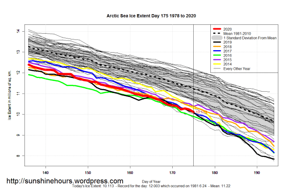 Sea Ice Extent (Global Antarctic and Arctic) – Day 175 – 2020