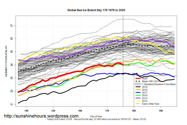 Sea Ice Extent (Global Antarctic and Arctic) – Day 176 – 2020