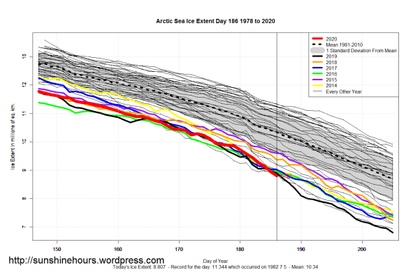 Sea Ice Extent (Global Antarctic and Arctic) – Day 186 – 2020