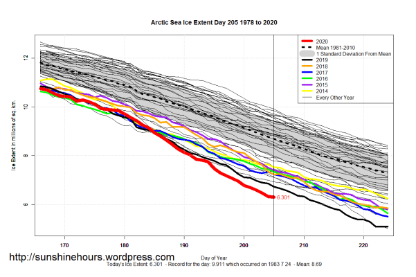 Sea Ice Extent (Global Antarctic and Arctic) – Day 205 – 2020