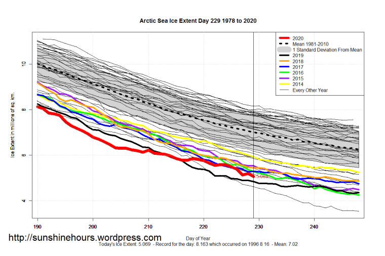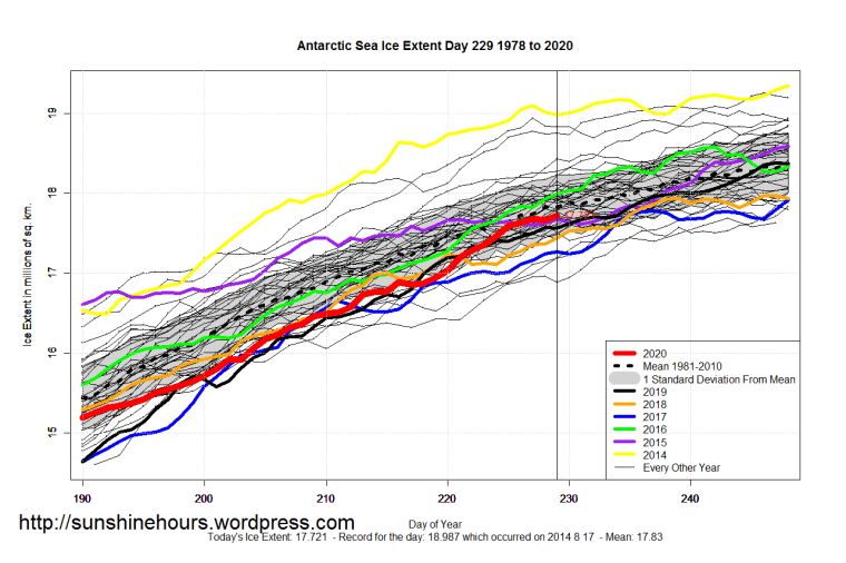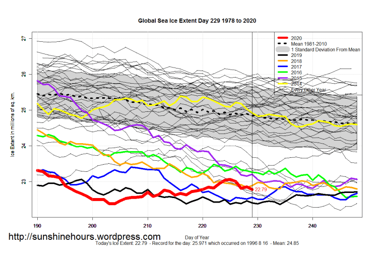 Sea Ice Extent (Global Antarctic and Arctic) – Day 229 – 2020 Published on August 17, 2020August 17, 2020 by sunshinehours1 South / North Like Loading... Related