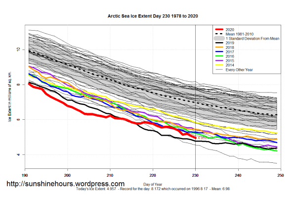 Sea Ice Extent (Global Antarctic and Arctic) – Day 230 – 2020