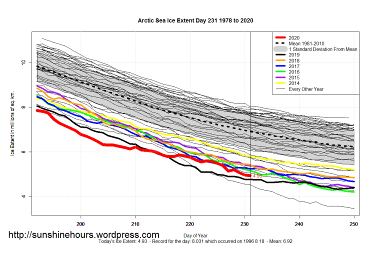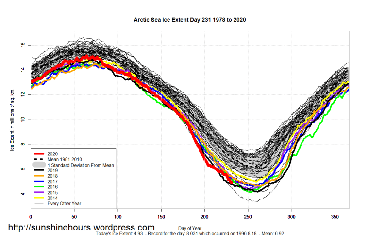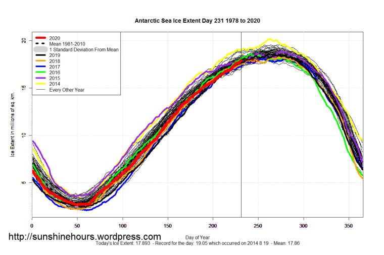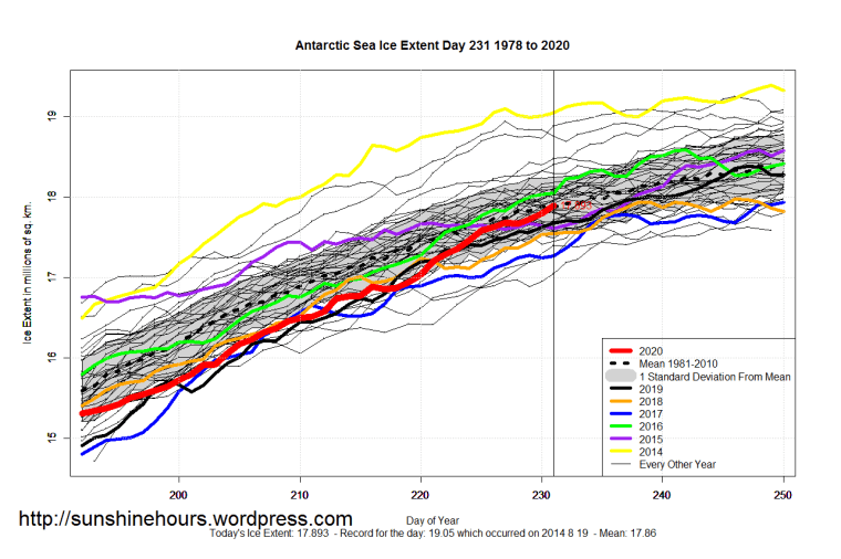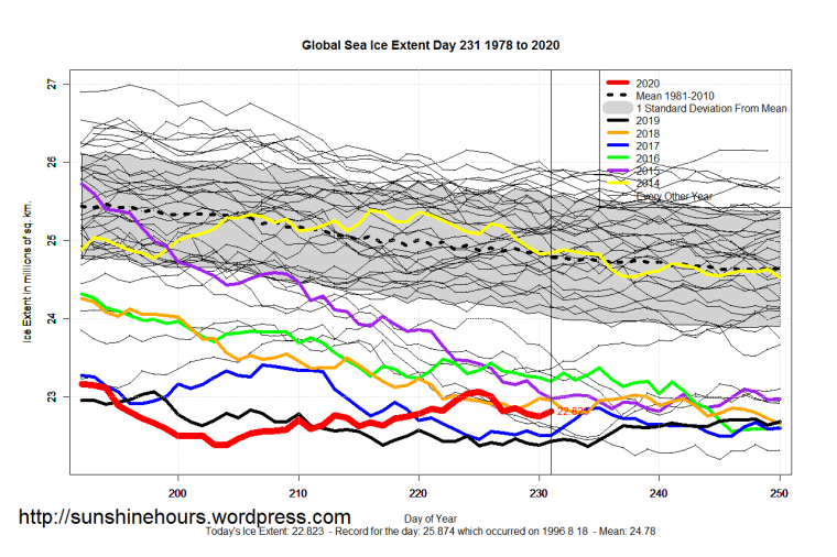 Sea Ice Extent (Global Antarctic and Arctic) – Day 231 – 2020 Published on August 19, 2020August 19, 2020 by sunshinehours1 South / North Like Loading... Related