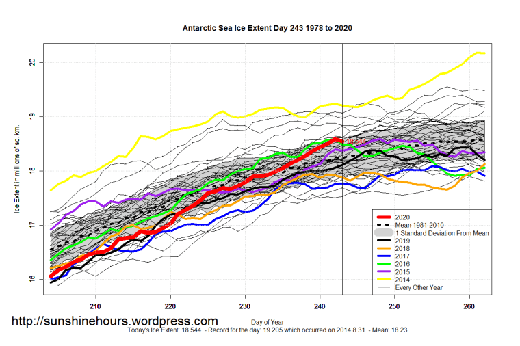Sea Ice Extent (Global Antarctic and Arctic) – Day 243 – 2020 Published on August 31, 2020August 31, 2020 by sunshinehours1 South / North Like Loading... Related
