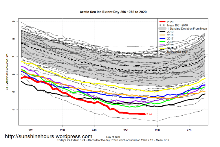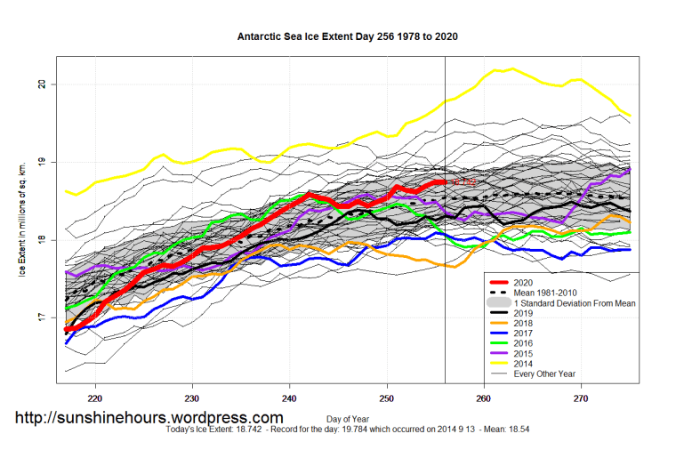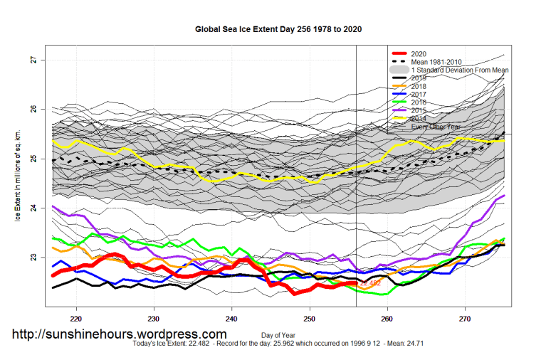 One thought on “Sea Ice Extent (Global Antarctic and Arctic) – Day 256 – 2020