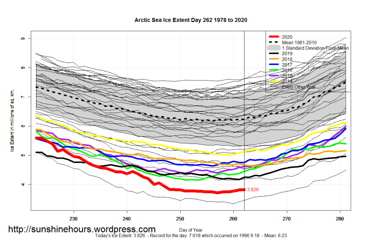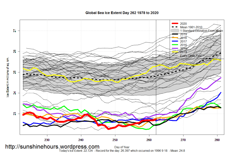 2 thoughts on “Sea Ice Extent (Global Antarctic and Arctic) – Day 262 – 2020