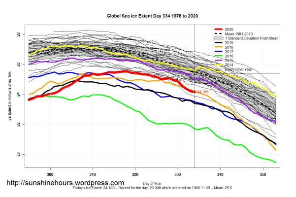 Sea Ice Extent (Global Antarctic and Arctic) – Day 334 2020