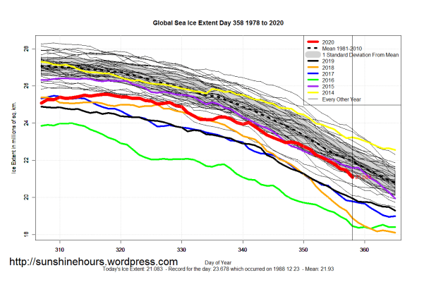 Sea Ice Extent (Global Antarctic and Arctic) – Day 358 2020