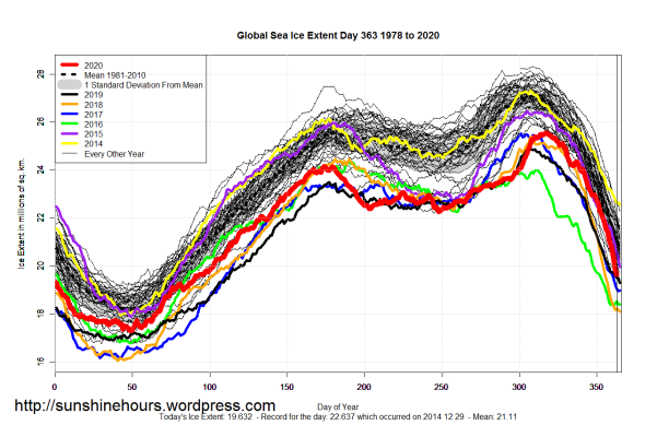 Sea Ice Extent (Global Antarctic and Arctic) – Day 363 – 2020