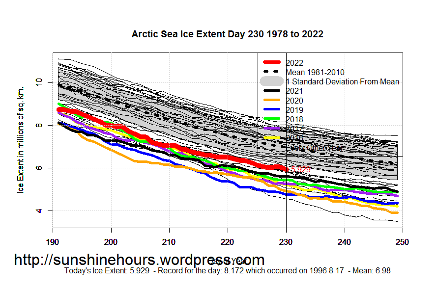 Sea Ice Extent (Global Antarctic and Arctic) – Day 230 – 2022 Published on August 19, 2022 by sunshinehours1 South / North Like Loading... Related