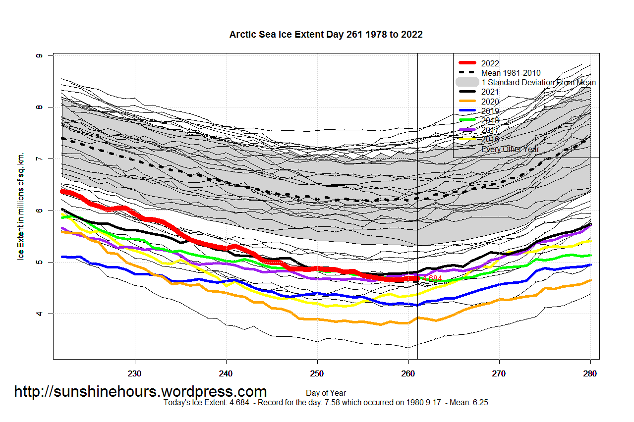 Sea Ice Extent (Global Antarctic and Arctic) – Day 261 – 2023 Published on September 19, 2022 by sunshinehours1 South / North Like Loading... Related