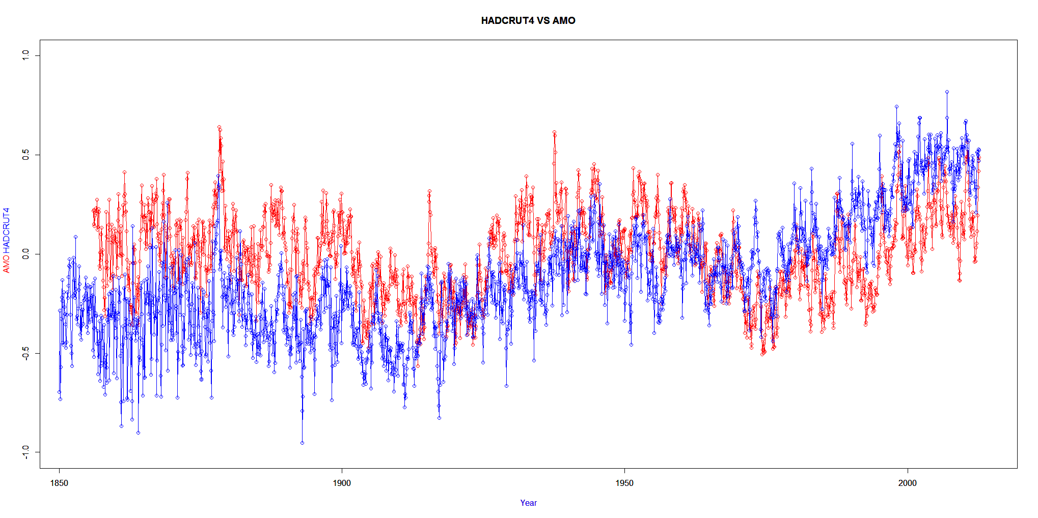 3) The cross over point is around 1997 which is when the AMO went officially positive (it sometimes goes opposite to the main trend for a few months)