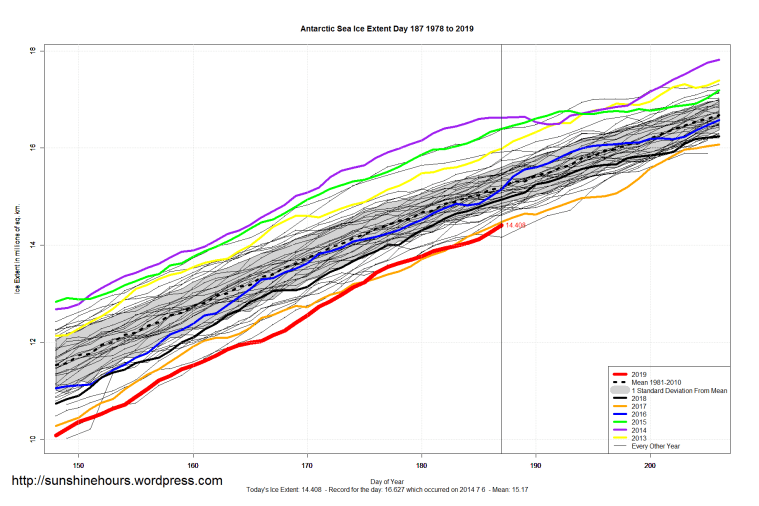 Sea Ice Extent (Global Antarctic and Arctic) – Day 187 – 2019 Published on July 7, 2019July 7, 2019 by sunshinehours12 Comments South / North