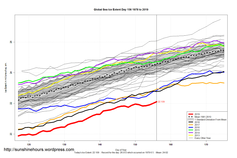 Sea Ice Extent (Global Antarctic and Arctic) – Day 156 – 2019 Published on June 6, 2019June 6, 2019 by sunshinehours12 Comments South / North