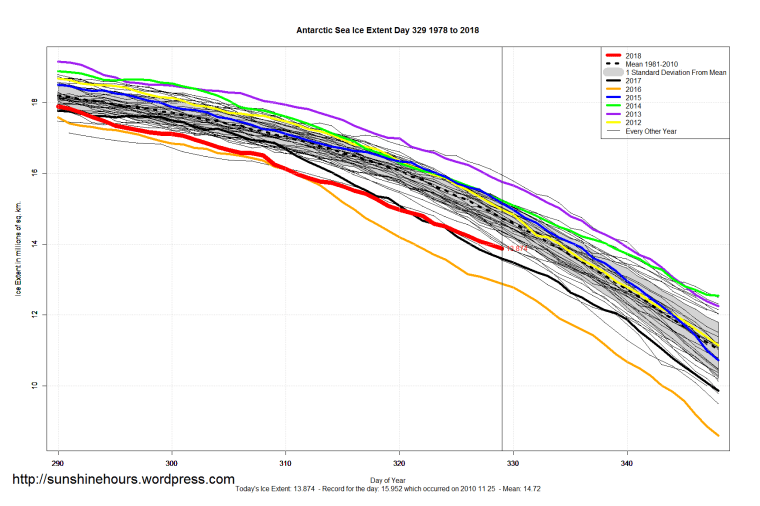 Sea Ice Extent (Global Antarctic and Arctic) – Day 329 – 2018 Published on November 26, 2018November 26, 2018 by sunshinehours12 Comments South / North