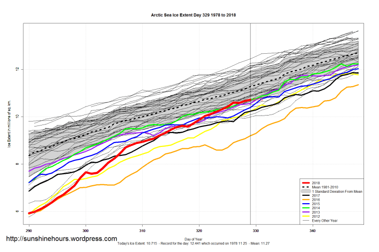 Sea Ice Extent (Global Antarctic and Arctic) – Day 326 – 2018 Published on November 23, 2018November 23, 2018 by sunshinehours11 Comment Arctic is within 1 STD South / North