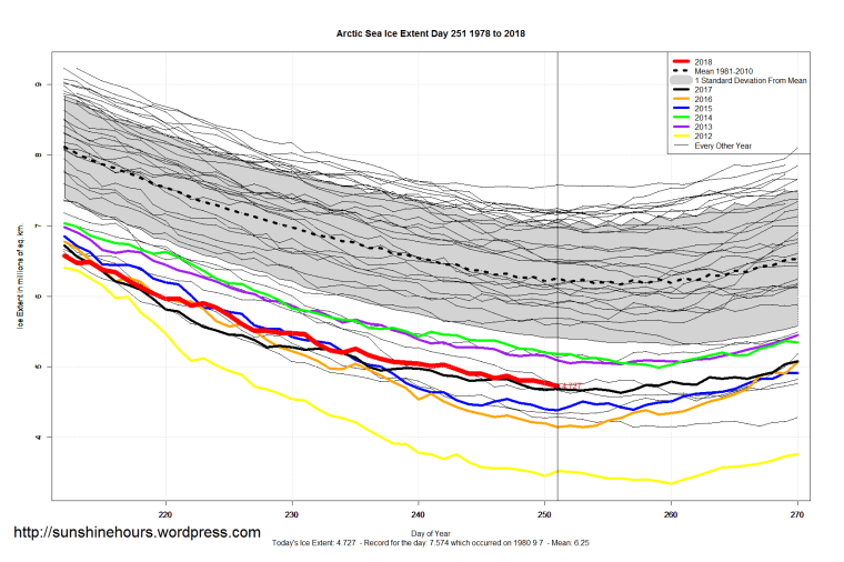 Sea Ice Extent (Global Antarctic and Arctic) – Day 250 – 2018 Published on September 8, 2018September 8, 2018 by sunshinehours11 Comment Arctic is 1.3 million higher than 2012 on day 250. South / North