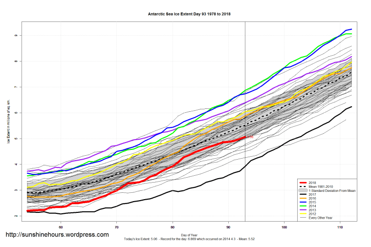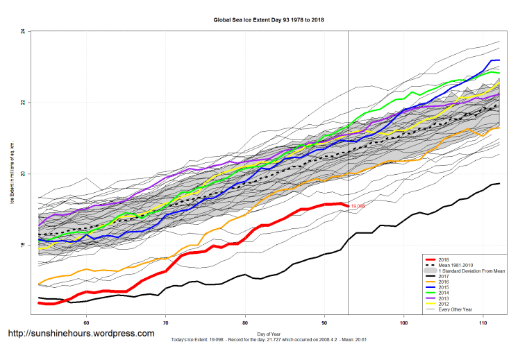 Sea Ice Extent (Global Antarctic and Arctic) – Day 93 – 2018 Published on April 4, 2018April 4, 2018 by sunshinehours1Leave a comment South / North