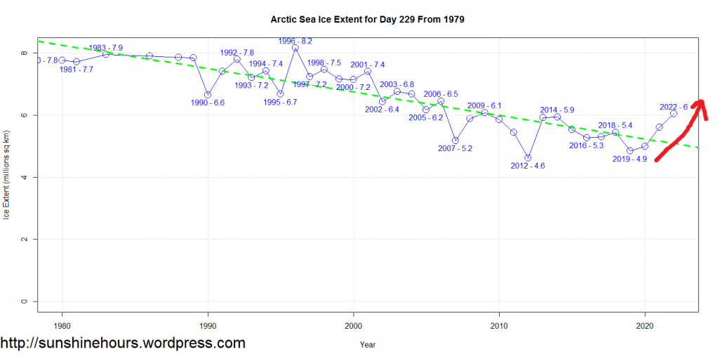 Sea Ice Extent (Global Antarctic and Arctic) – Day 230 – 2022