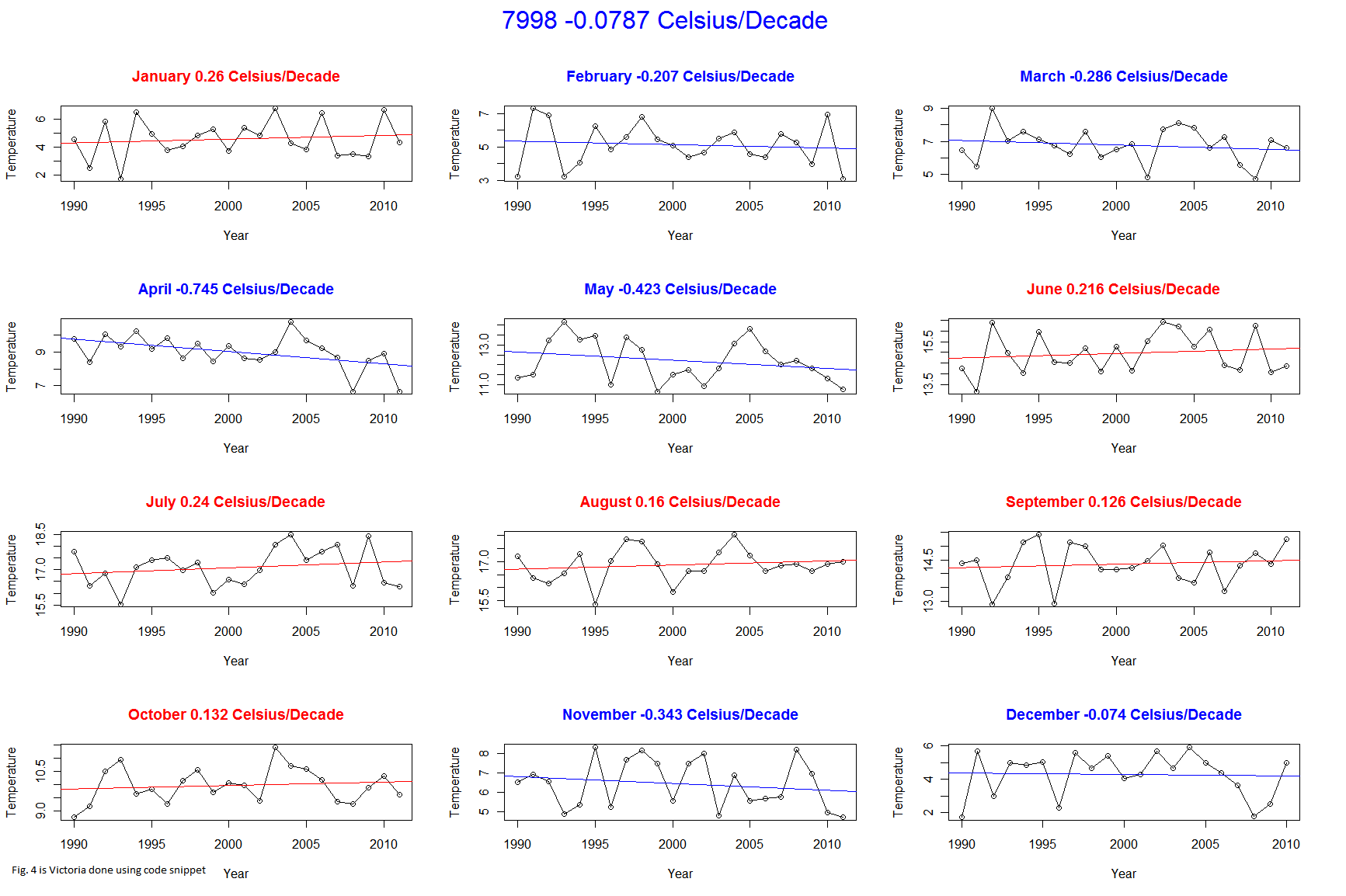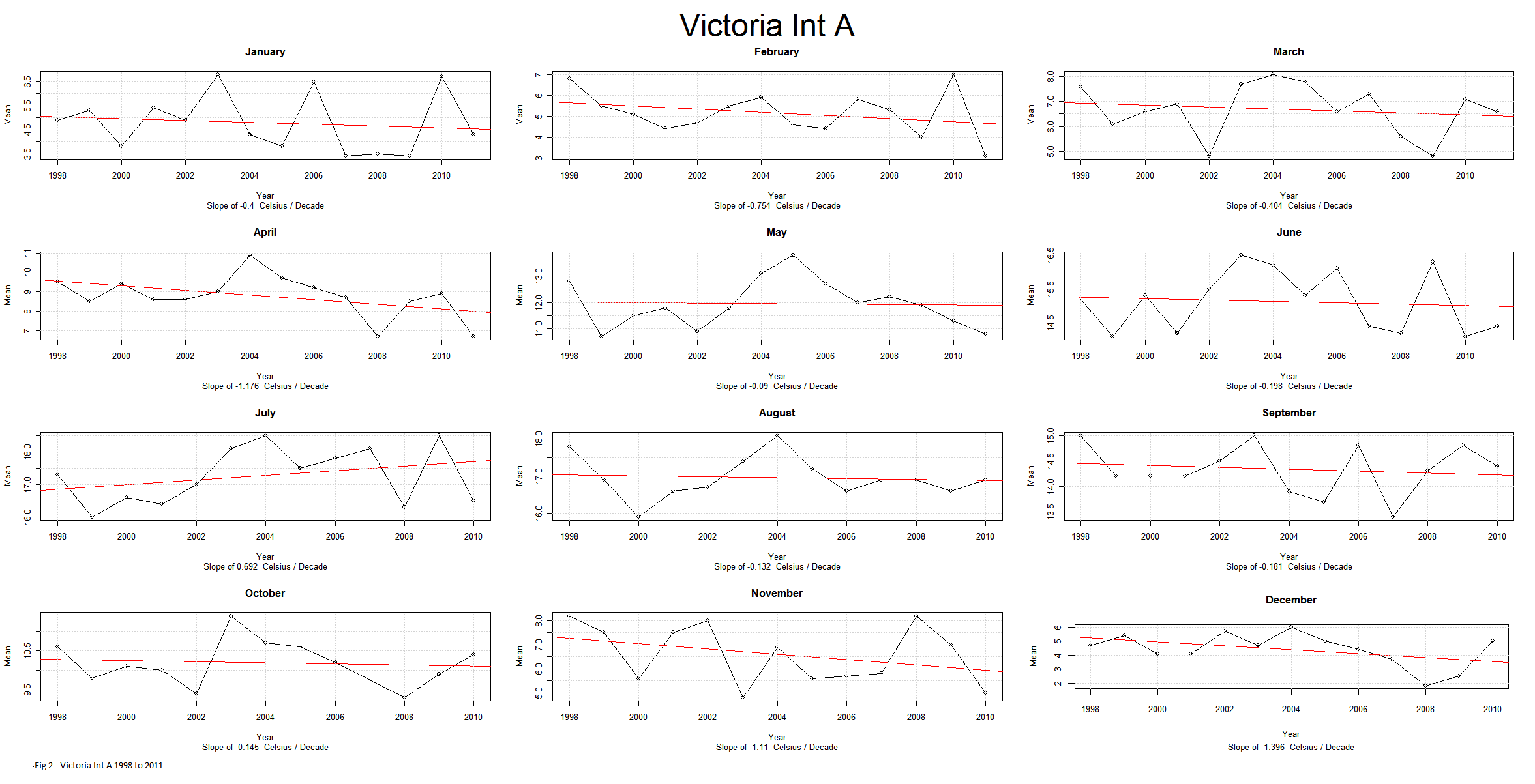By then I had decided it was time to learn R. I wrote an R script to scrape the EC site for data and then I came across a tip that would allow me to segment a plot into 12 subplots and thought why not show each month. I picked Victoria Int A from 1998 to 2011. I chose to take the lm (linear model) value from [R] and multiply it by 10 to show the trend in C per decade.
