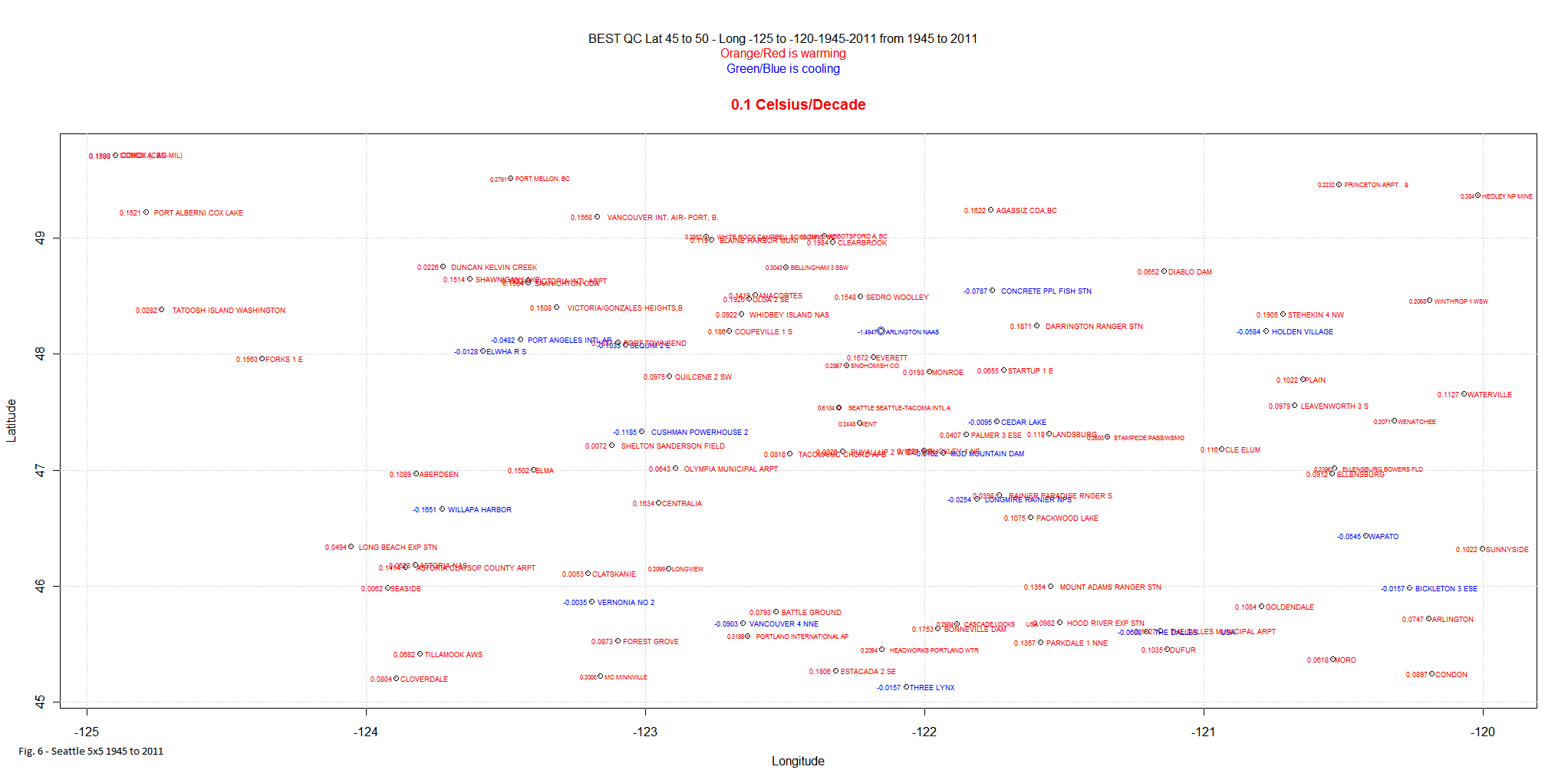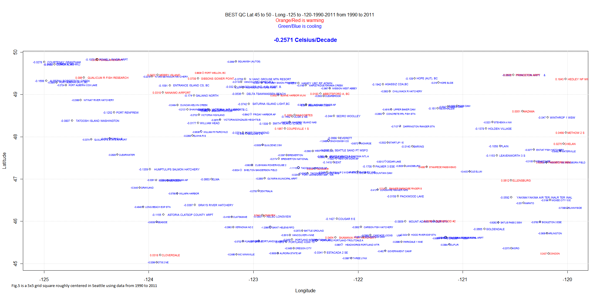 Fig. 5 is a “map” Fig. 5 is a 5×5 grid square centered around Seattle using data from 1990 to 2011 (only stations with data in 1990 and data in 2011) It is really cooling by -.2571 Celsius per decade.