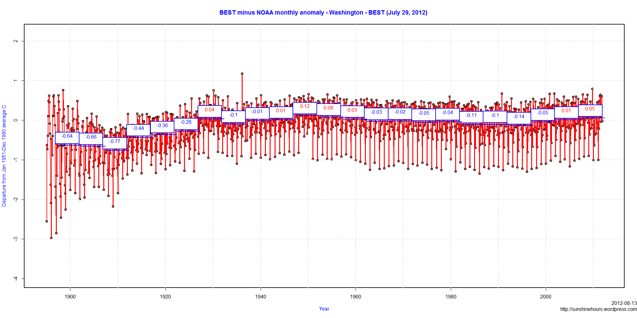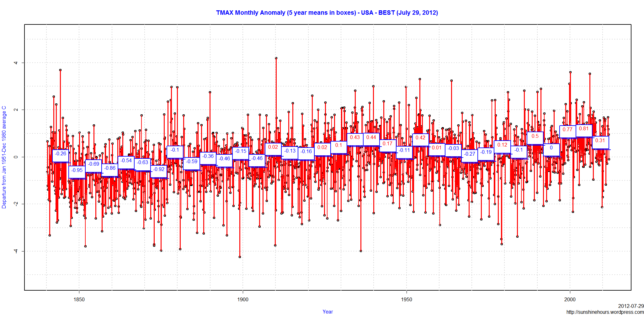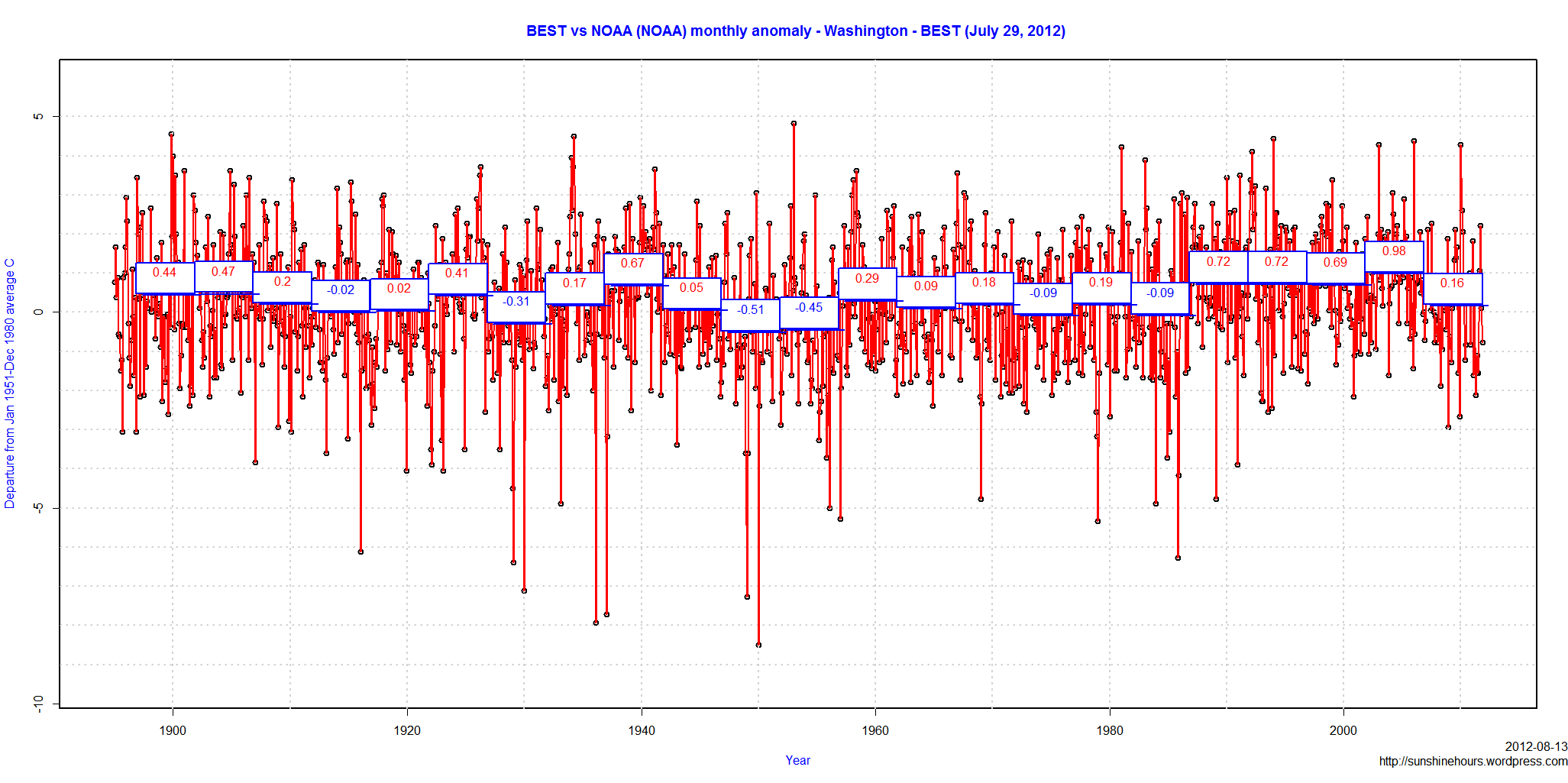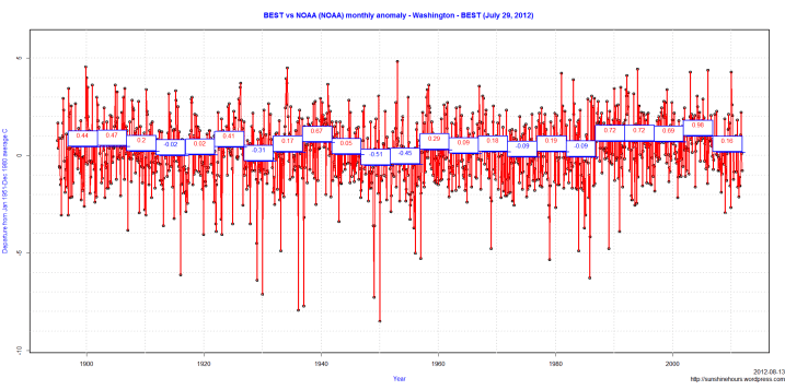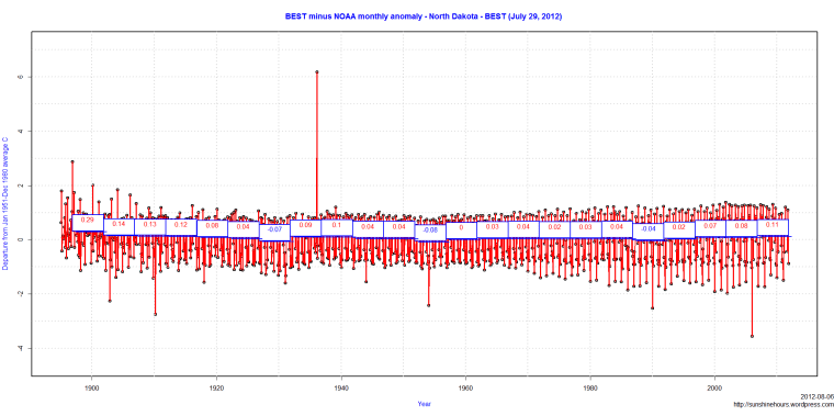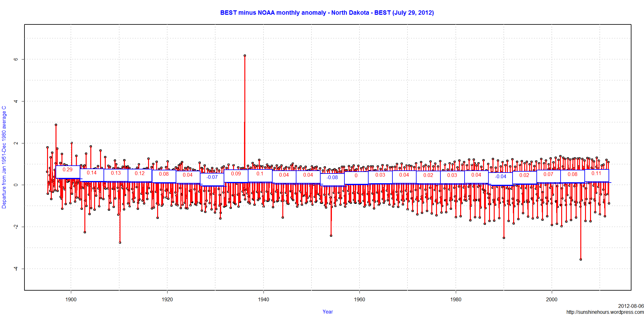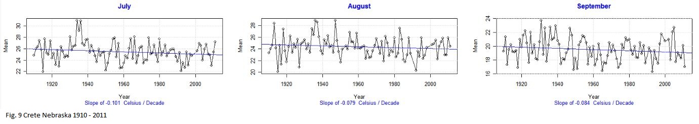 After running my script for a few regions I am just amazed at the difference between stations. Fig. 9 is Crete Nebraska, warming at a miniscule .031C/Decade since 1910! And yet July, August, September and October (not shown) are cooling and have never been as warm as the 1930s: