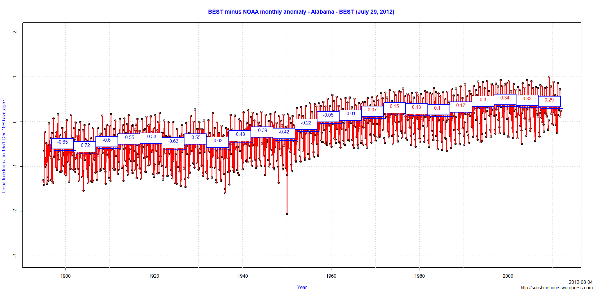 And, just to be fair, Fig. 6 is the same grid square 1945 to 2011. Notice that a few stations are still cooling and the warming trend is only .1C per decade.