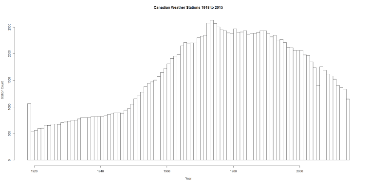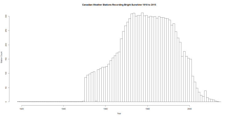 Once up a time (June of 1978 to be precise) if you downloaded Environment Canada’s monthly summaries, you would have found 313 stations with “Bright Sunshine” hours.