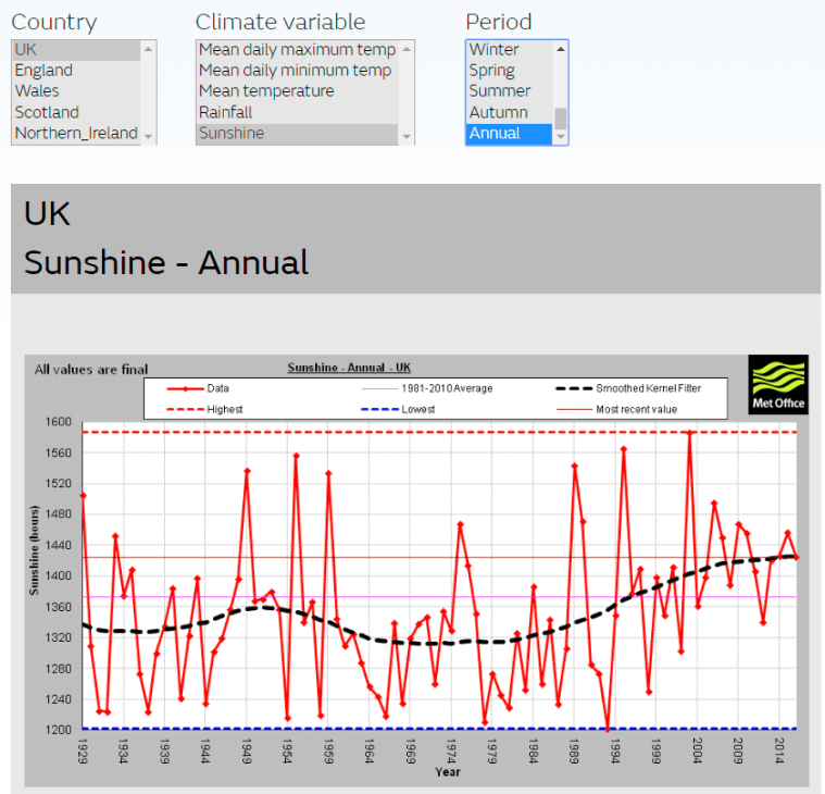 Here are three graphs. One shows the number of weather stations (half of what there used to be) and one shows the number collecting sunshine data. A 3rd graph shows what you can do with UK sunshine data.