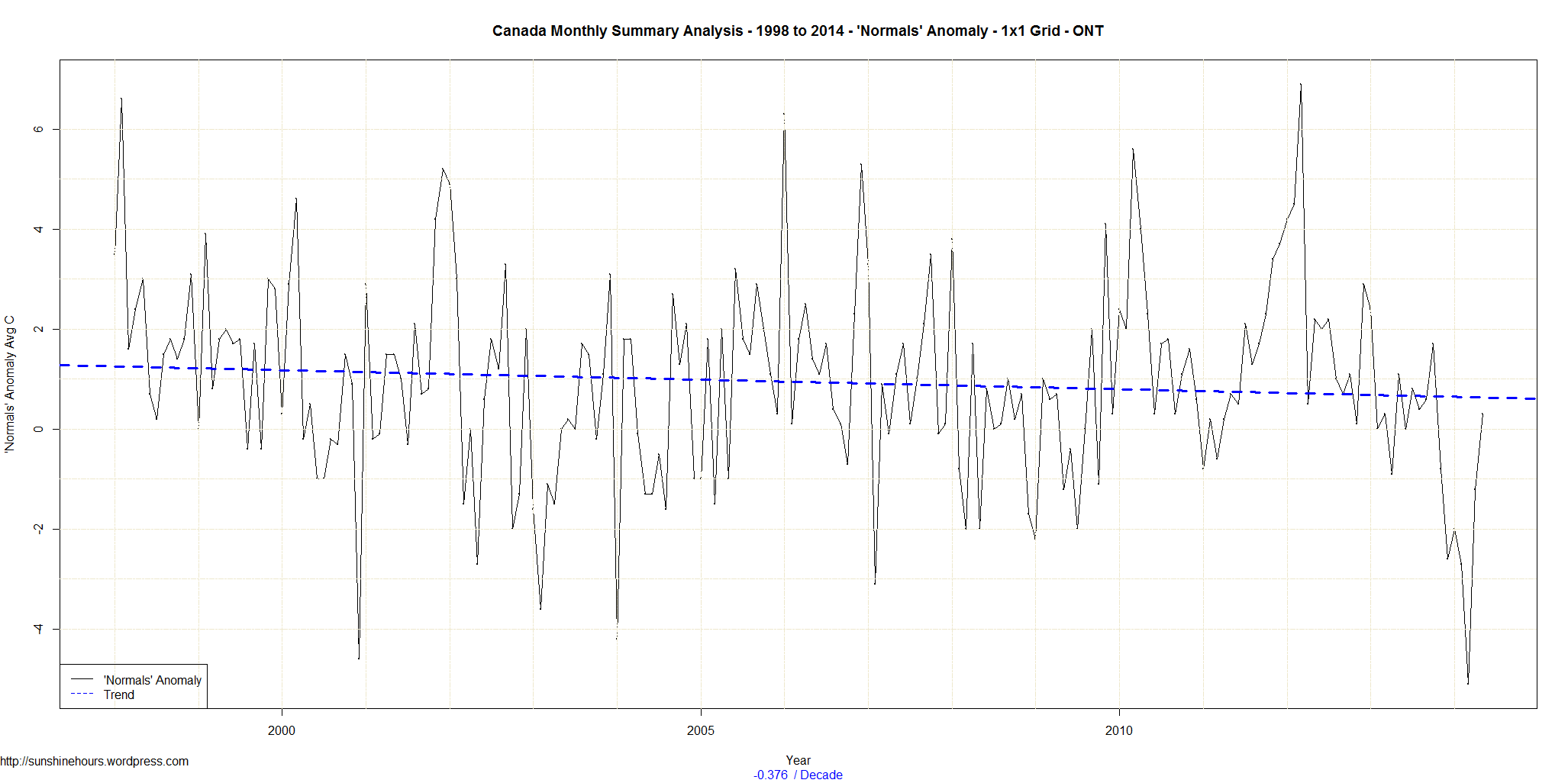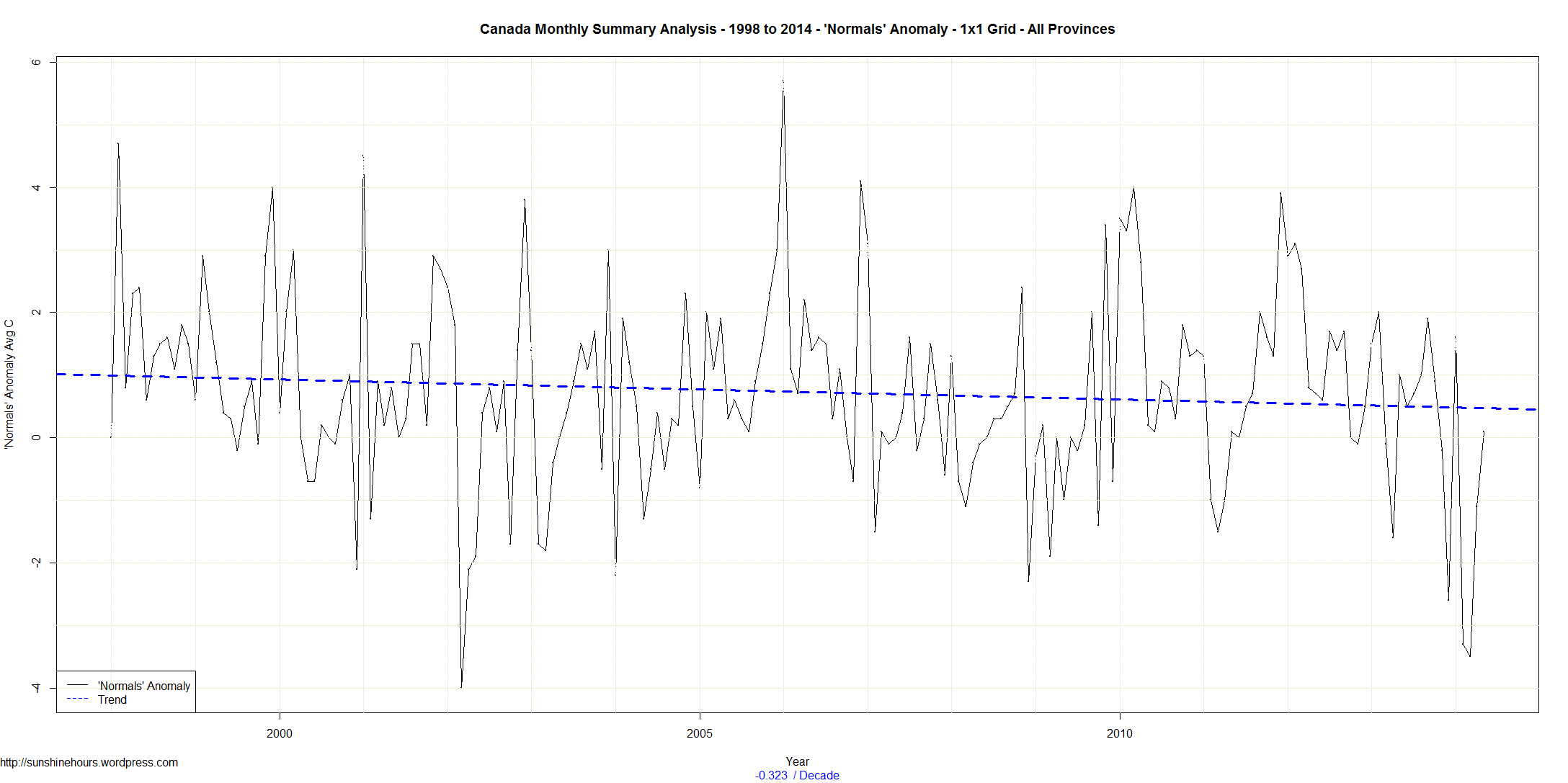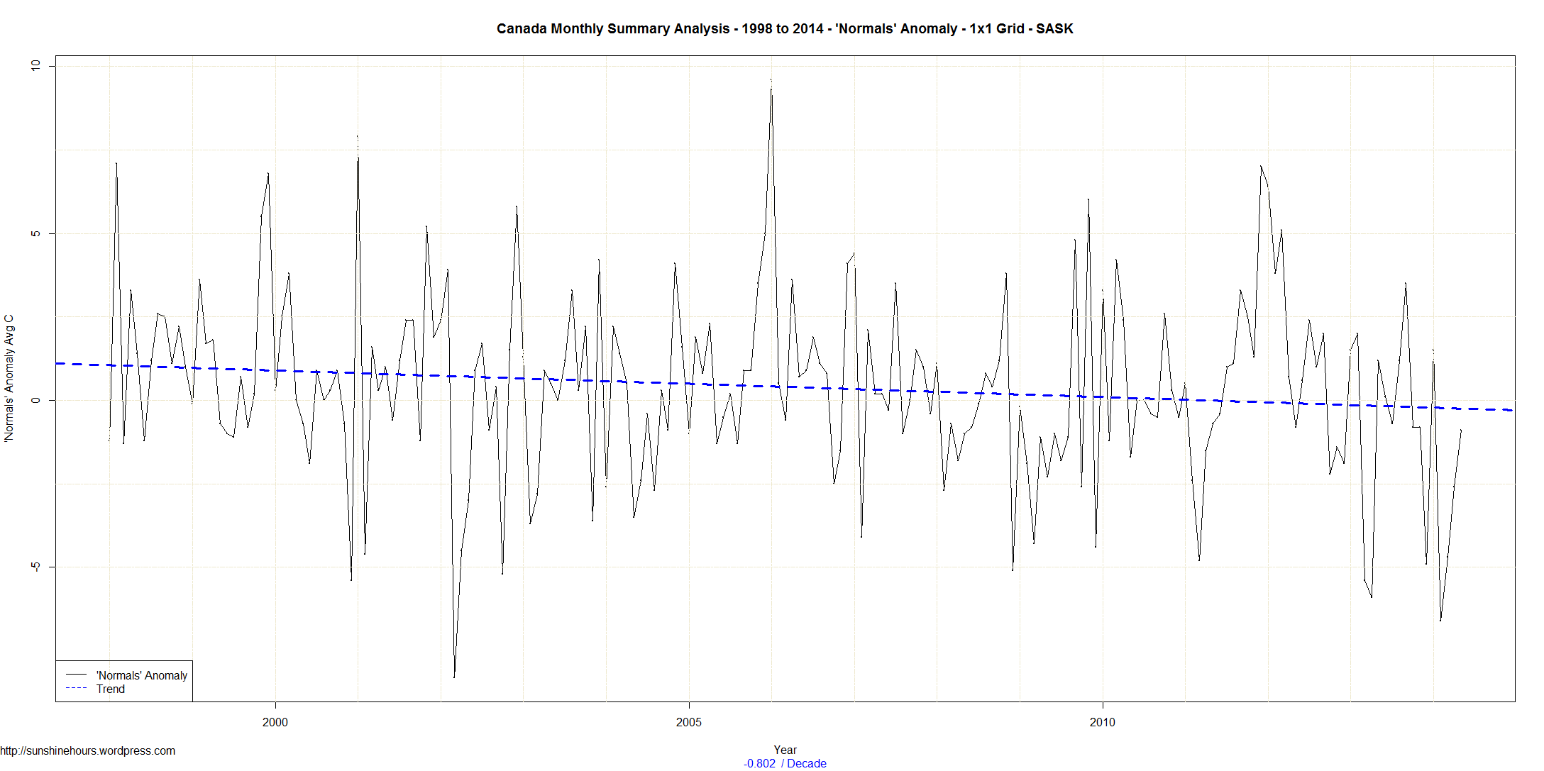 The trend for the whole country from 1998 is cooling at -0.32C/decade. Saskatchewan and Manitoba are cooling at over -.8 C /decade. Wow.