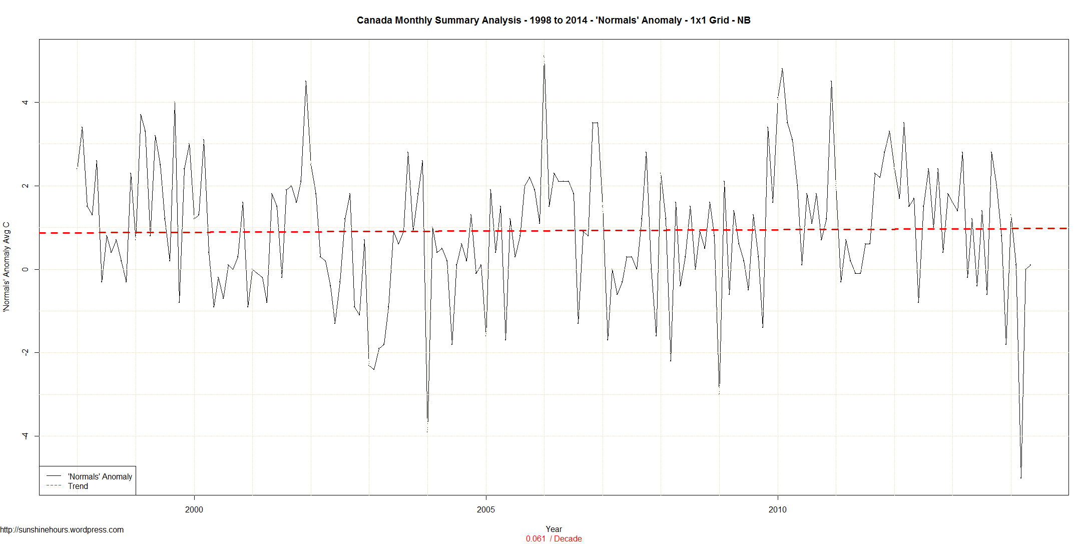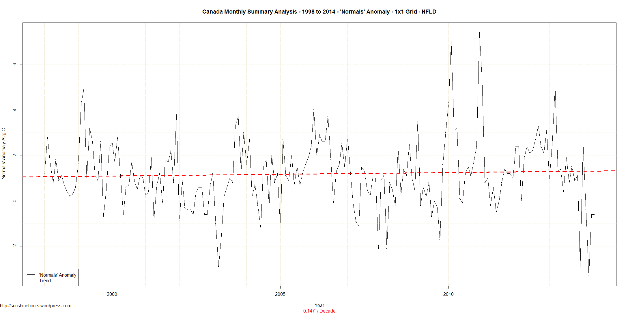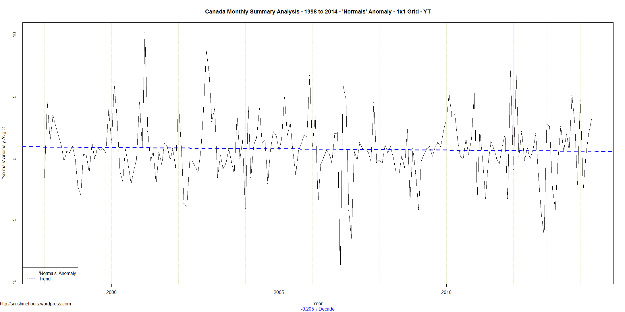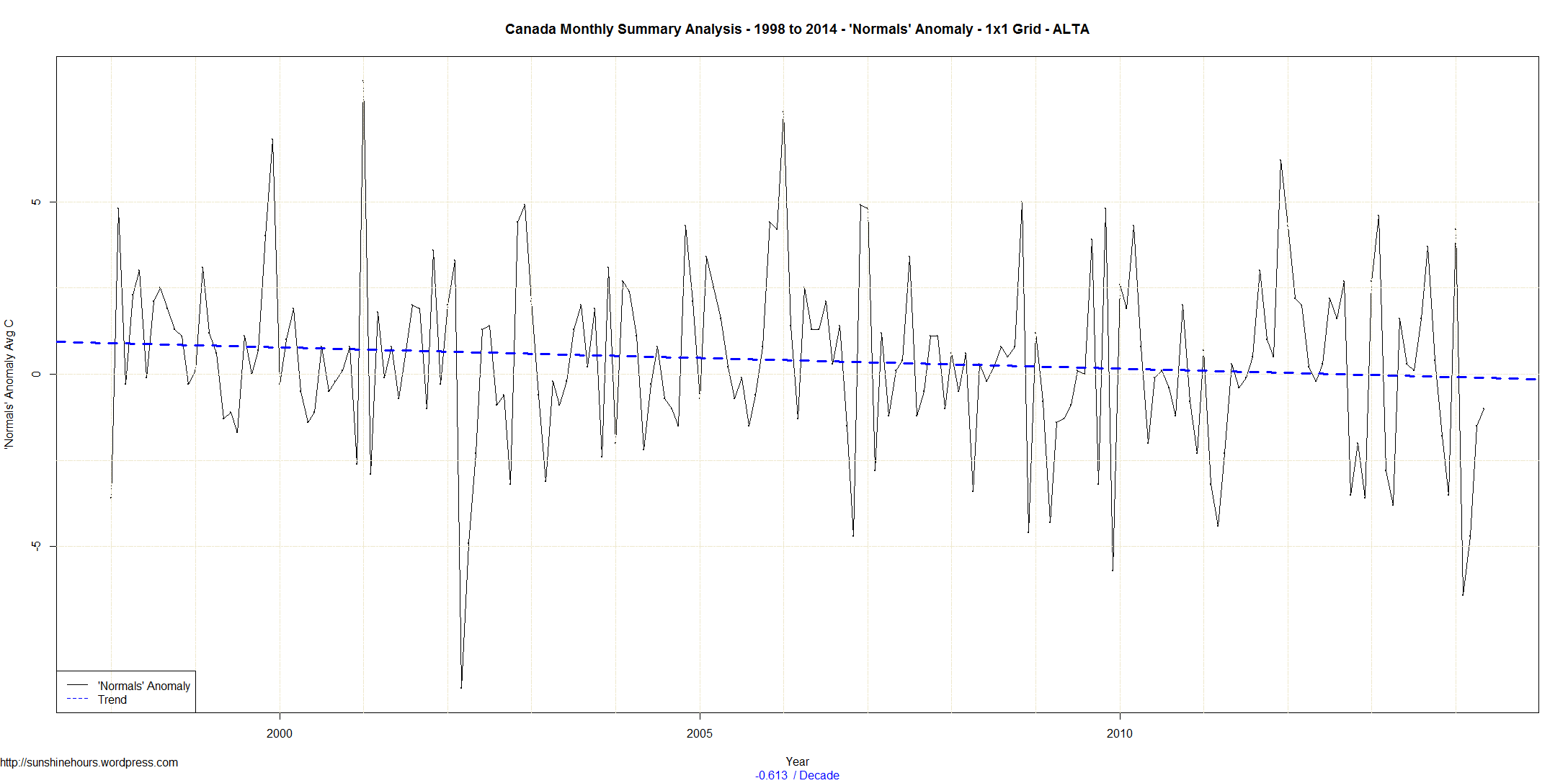 The trend for the whole country from 1998 is cooling at -0.32C/decade. Saskatchewan and Manitoba are cooling at over -.8 C /decade. Wow.