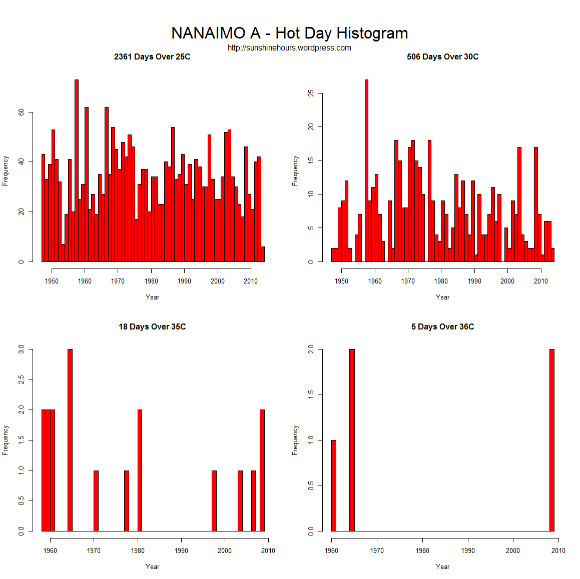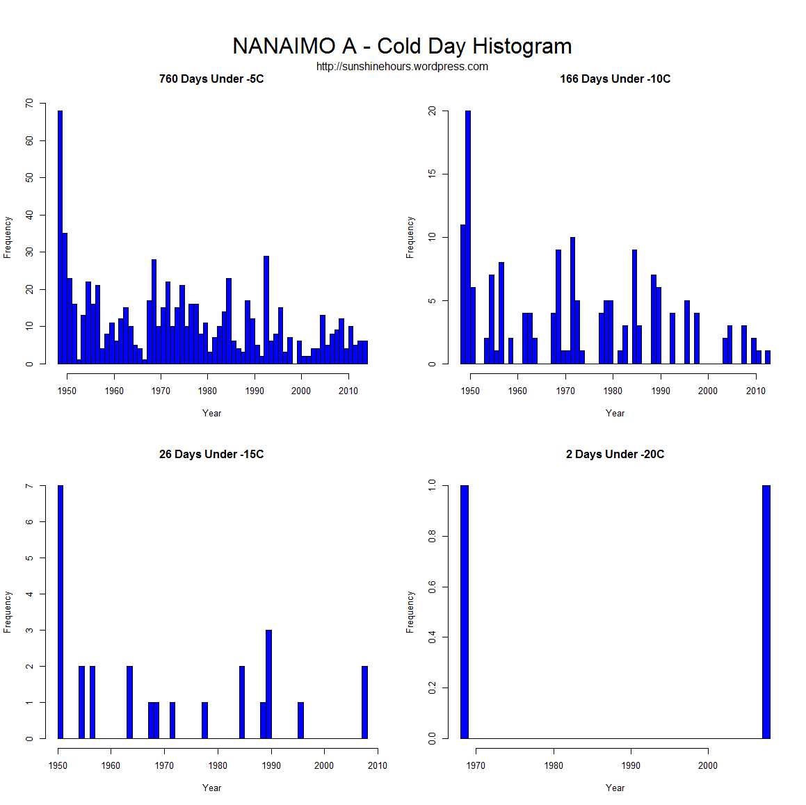 Every once in a while I visit the data for the weather station closest to my hometown on the west coast of Canada. The data only starts in the late 1940s so there is no extreme’s from the 1930s and 1940s.
