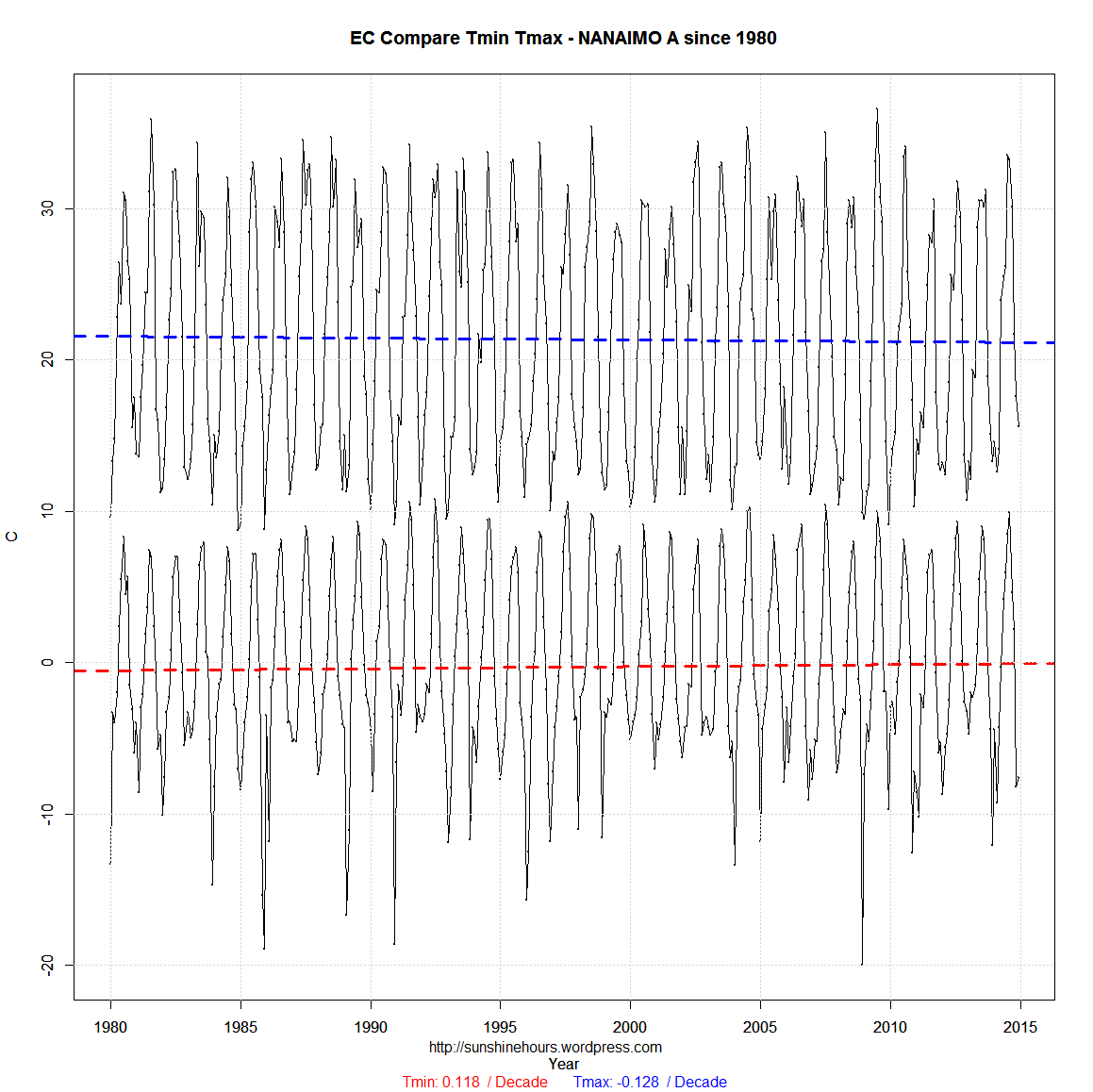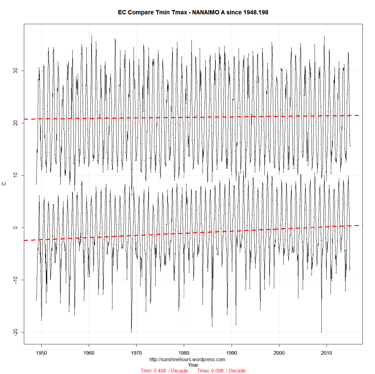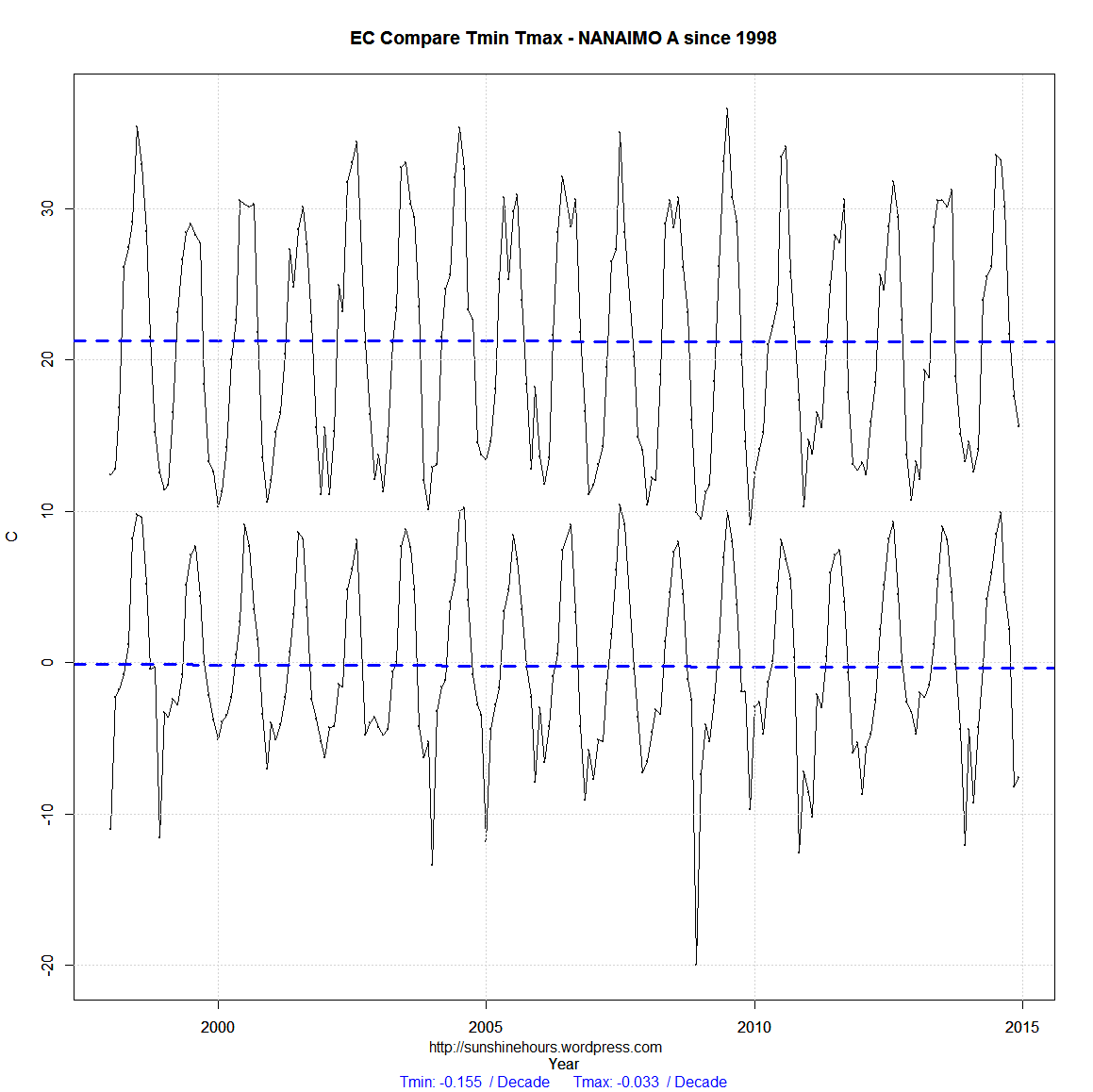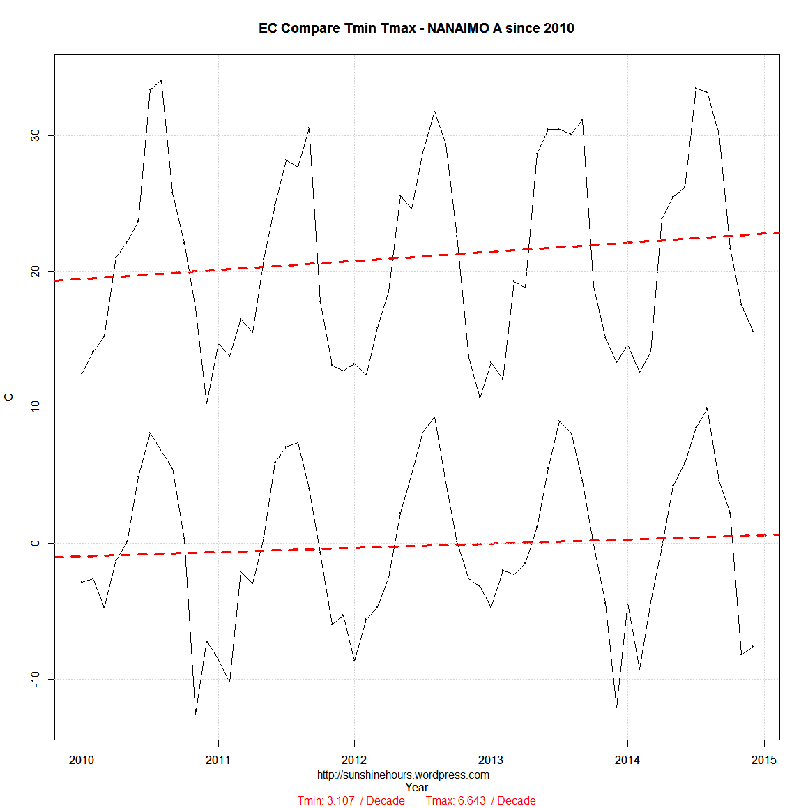 The three graphs below have the Tmin and Tmax data from the Environment Canada monthly reports up to the end of 2014.