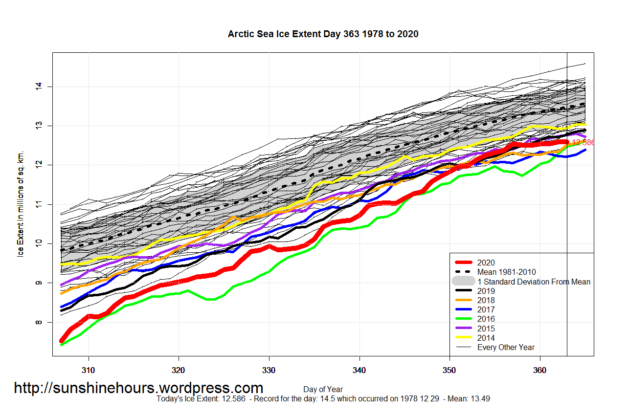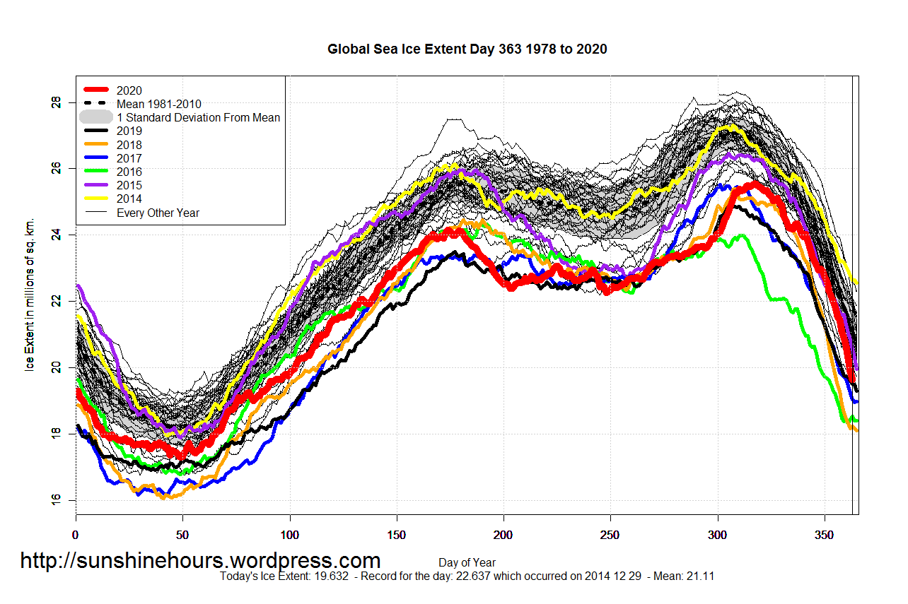 Sea Ice Extent (Global Antarctic and Arctic) – Day 363 – 2020 Published on December 29, 2020 by sunshinehours12 Comments South / North