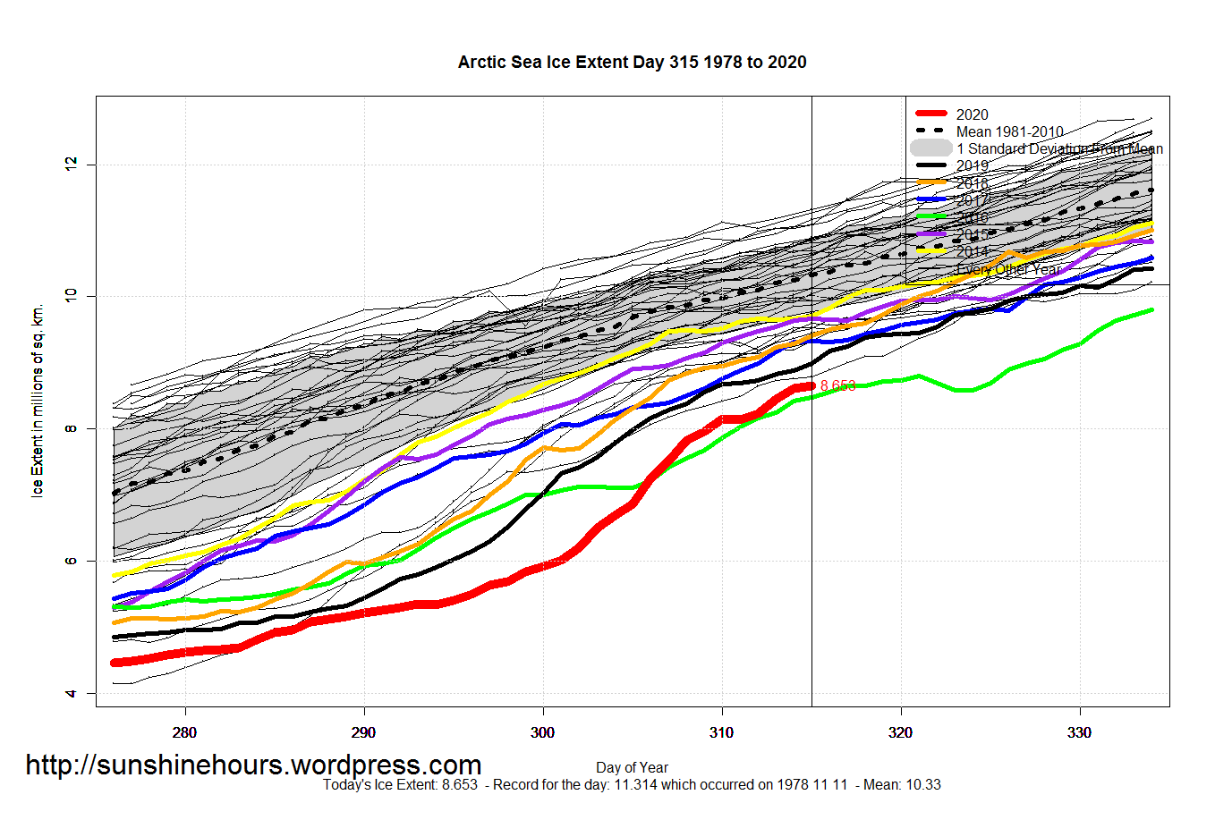 Sea Ice Extent (Global Antarctic and Arctic) – Day 315 – 2020 Published on November 11, 2020 by sunshinehours11 Comment South / North