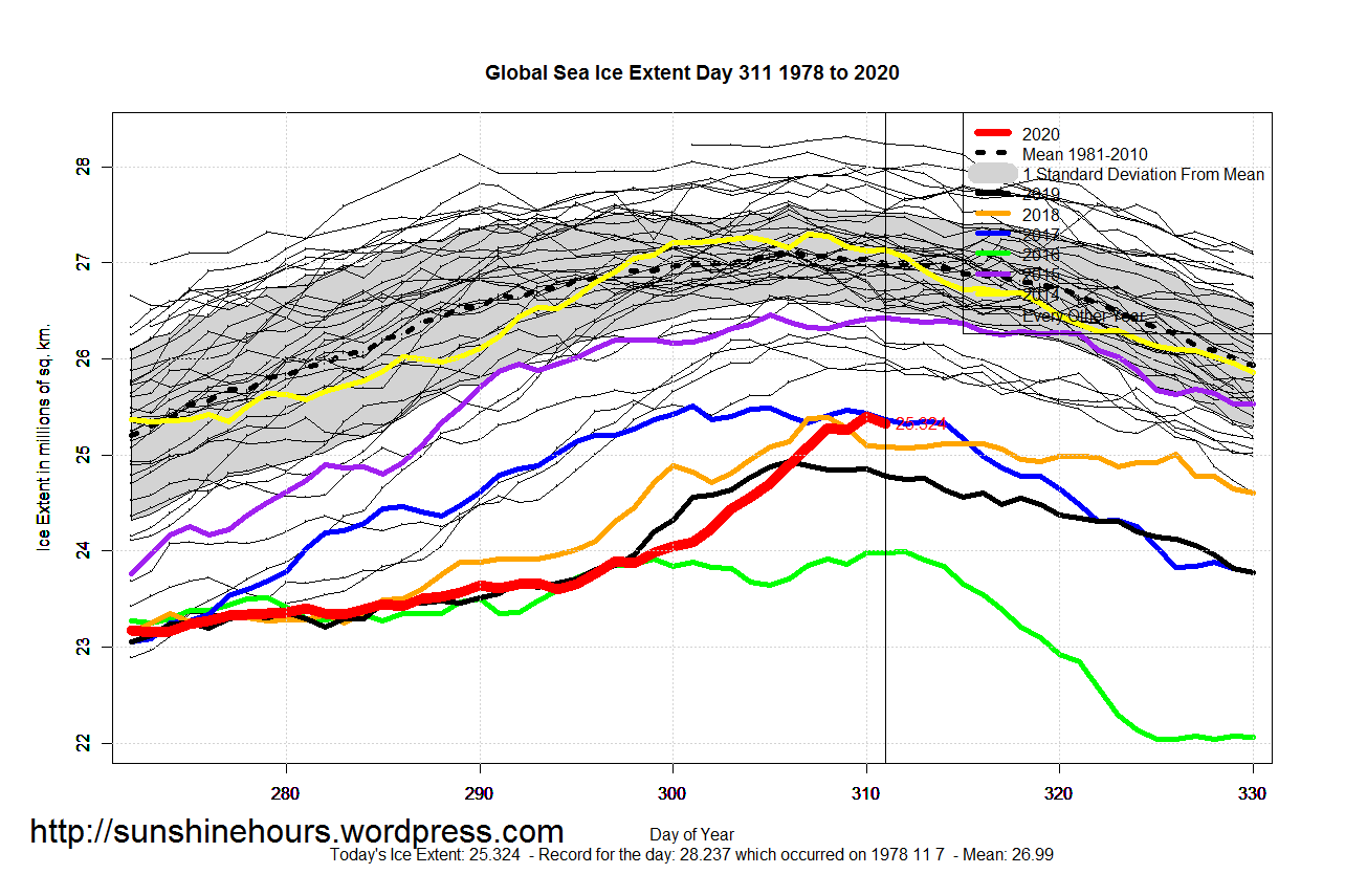 Sea Ice Extent (Global Antarctic and Arctic) – Day 309 – 2020 Published on November 6, 2020 by sunshinehours12 Comments South / North