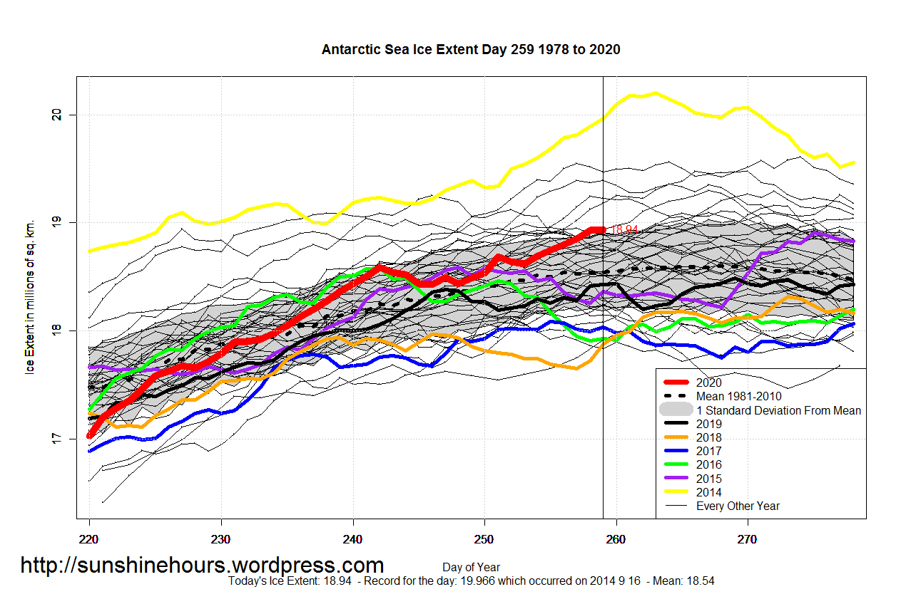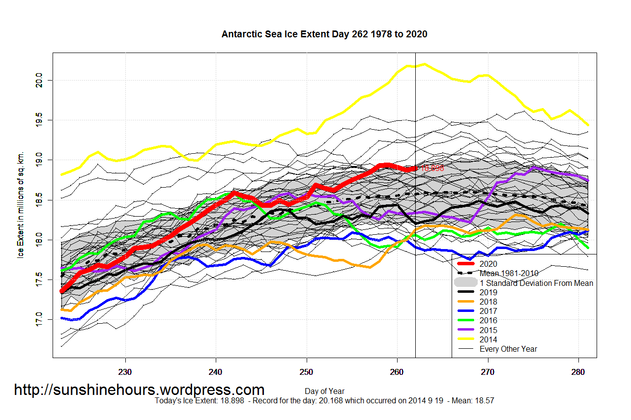 Sea Ice Extent (Global Antarctic and Arctic) – Day 262 – 2020 Published on September 19, 2020September 19, 2020 by sunshinehours12 Comments South / North