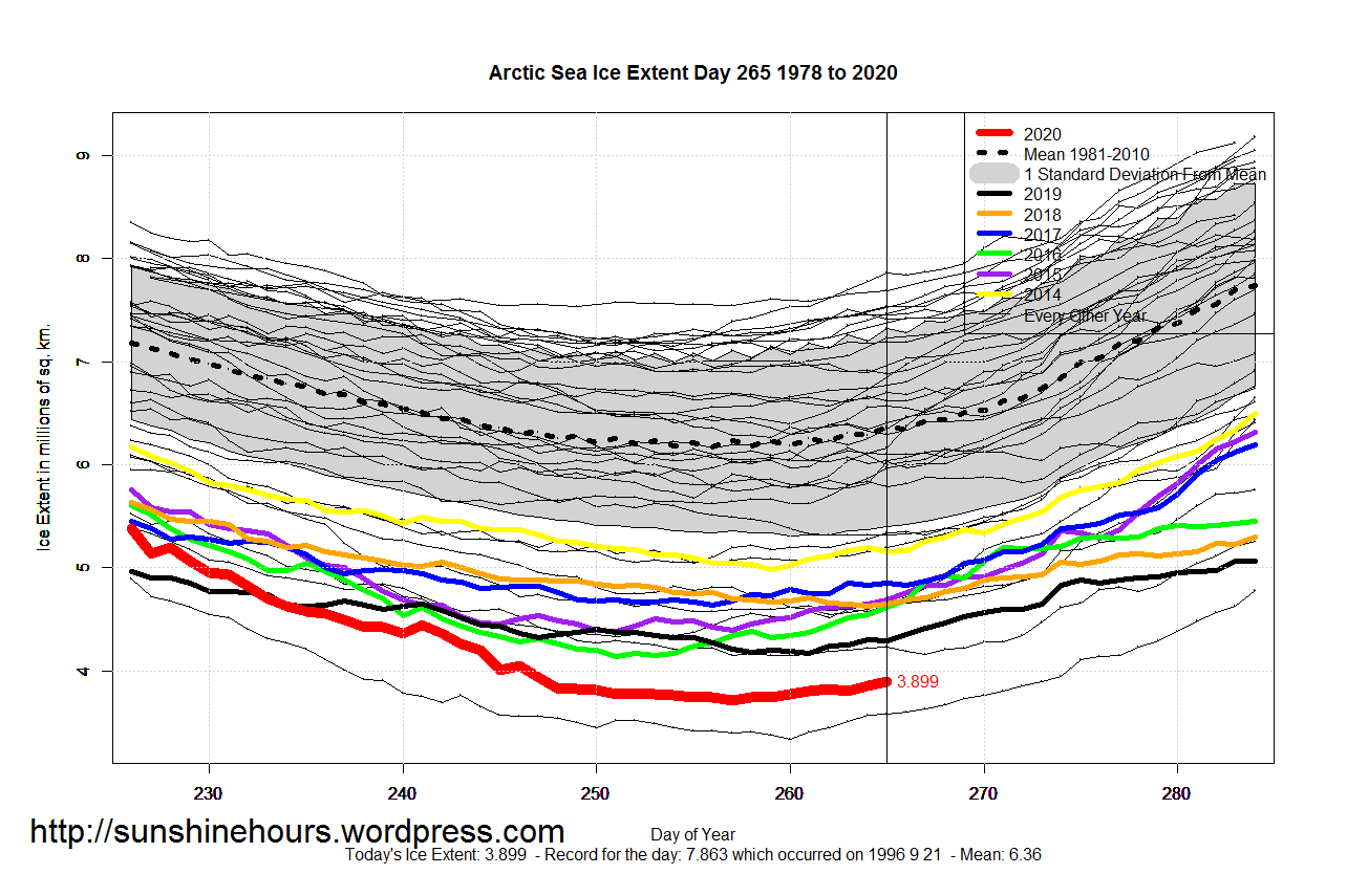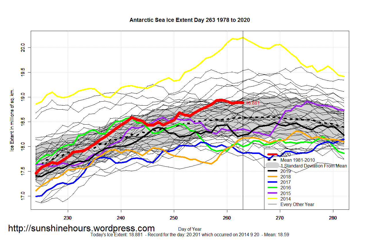 Sea Ice Extent (Global Antarctic and Arctic) – Day 263 – 2020 Published on September 20, 2020September 20, 2020 by sunshinehours11 Comment South / North