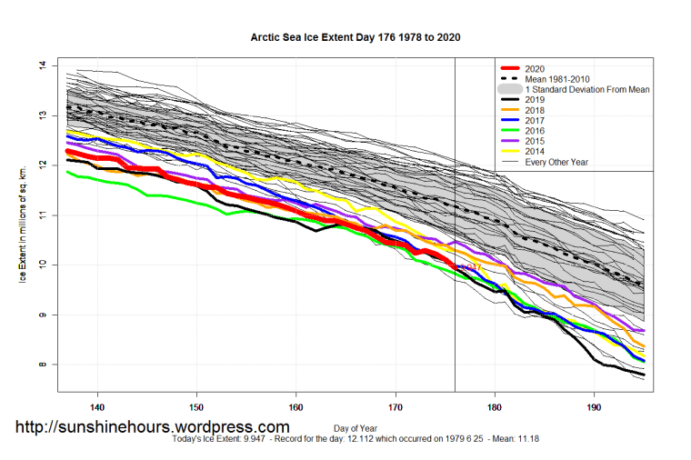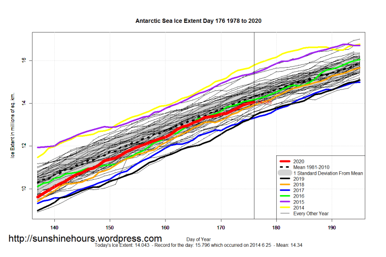 Sea Ice Extent (Global Antarctic and Arctic) – Day 176 – 2020 Published on June 25, 2020June 25, 2020 by sunshinehours11 Comment South / North