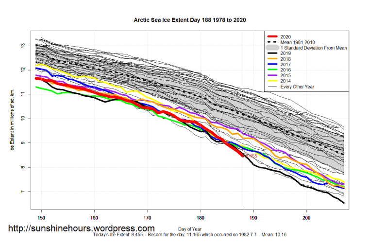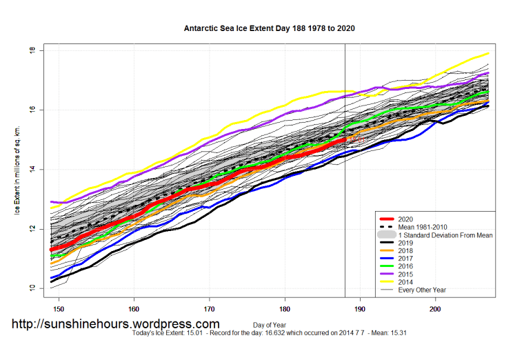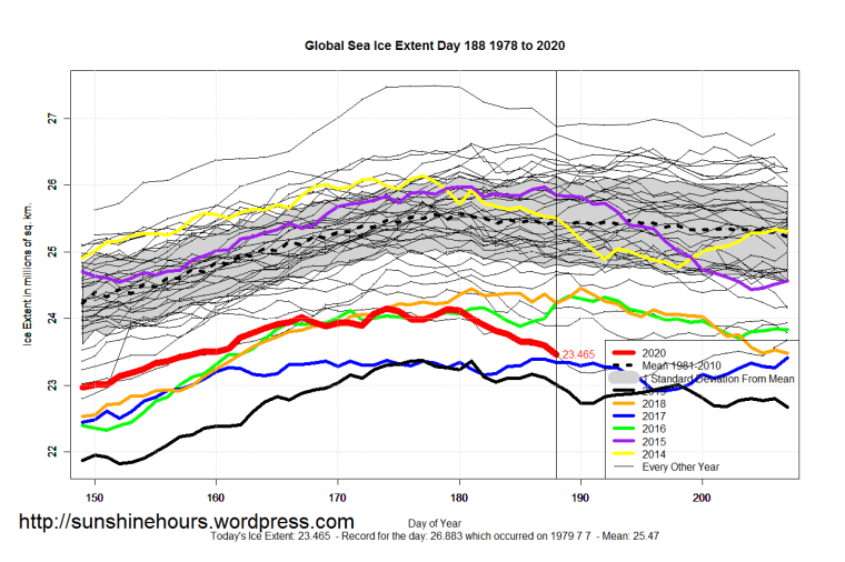 Sea Ice Extent (Global Antarctic and Arctic) – Day 188 – 2020 Published on July 7, 2020July 7, 2020 by sunshinehours11 Comment South / North